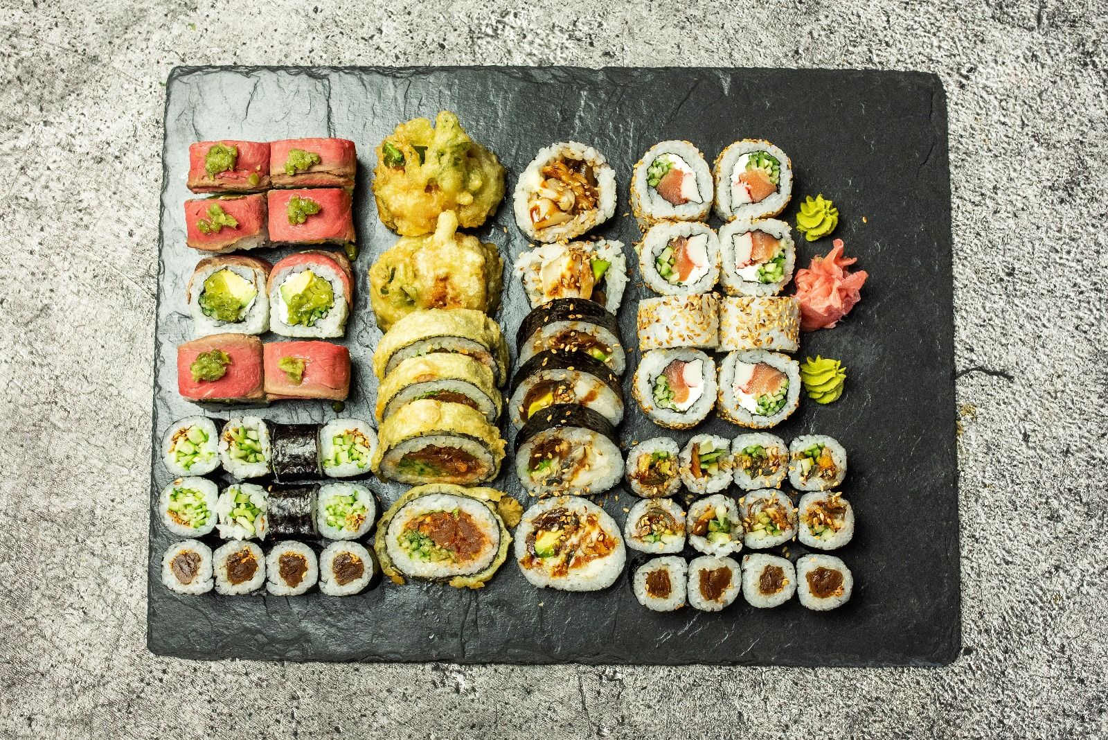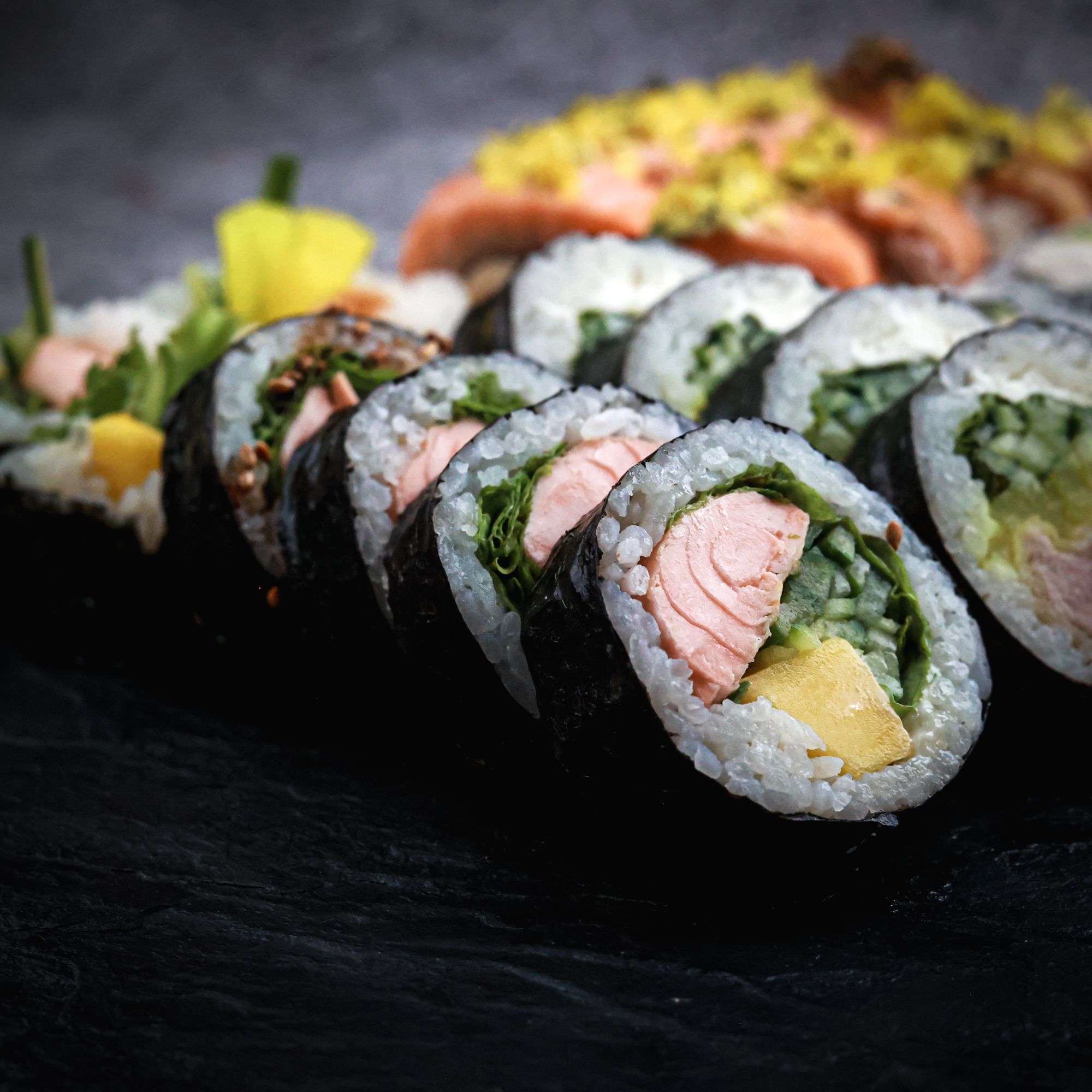 8x uramaki z warzywami obłożone wołowiną wolno-gotowaną (rzodkiew, ogórek, awokado, kizami, serek)