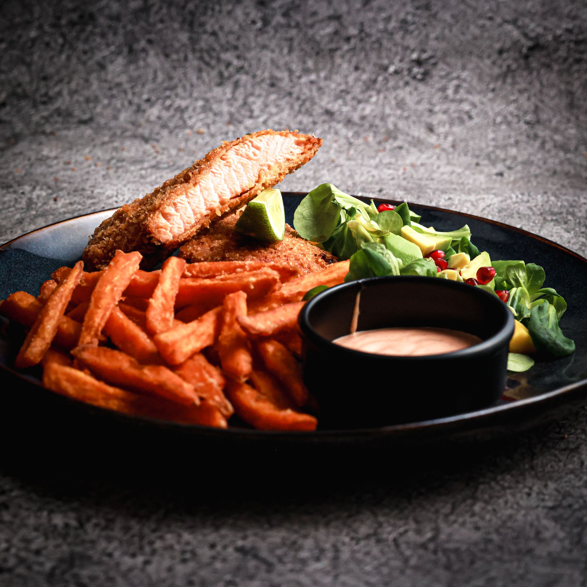 W chrupiącej panierce , serwowany z frytkami z batatów, sosem spicy mayo i sałatką