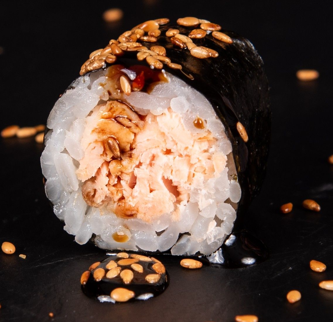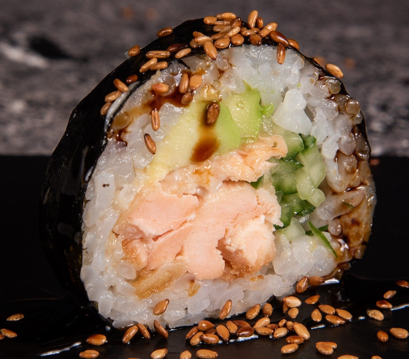 8x uramaki z łososiem grillowanym (awokado, majonez, sos kabayaki, sezam)