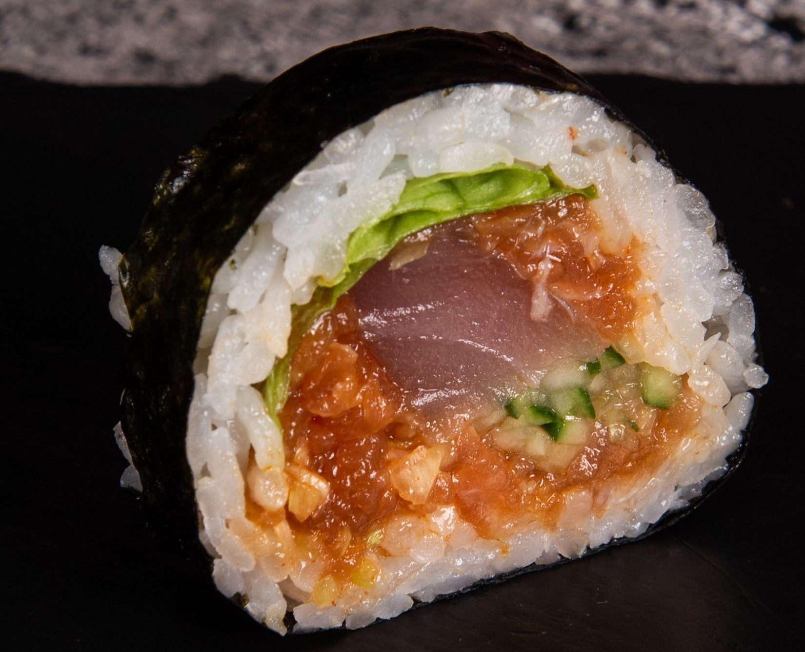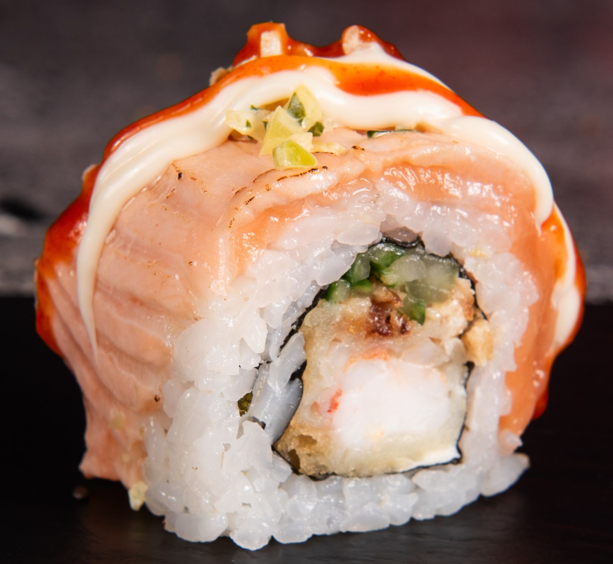 8x uramaki z tuńczykiem obłożone łososiem opalanym